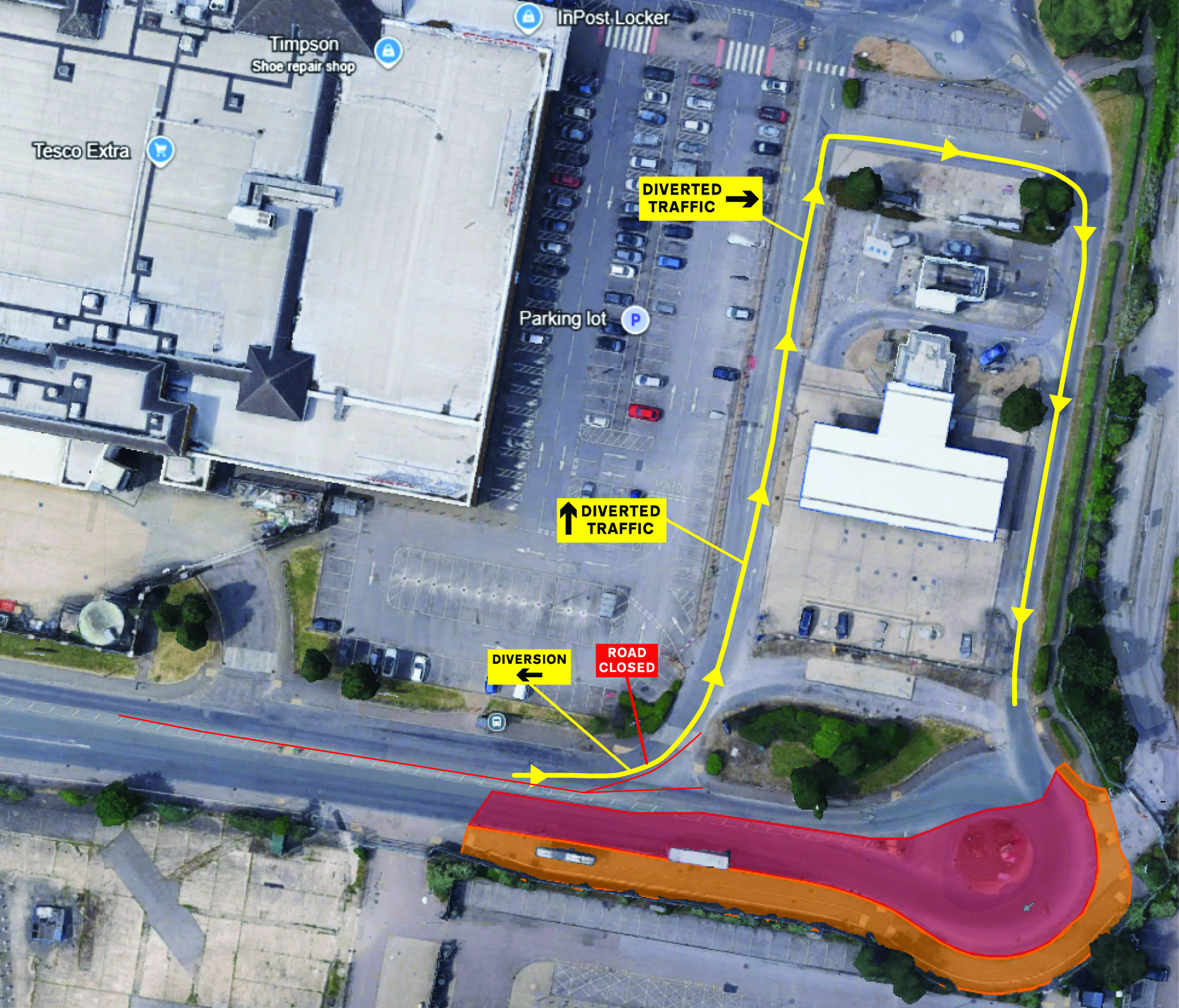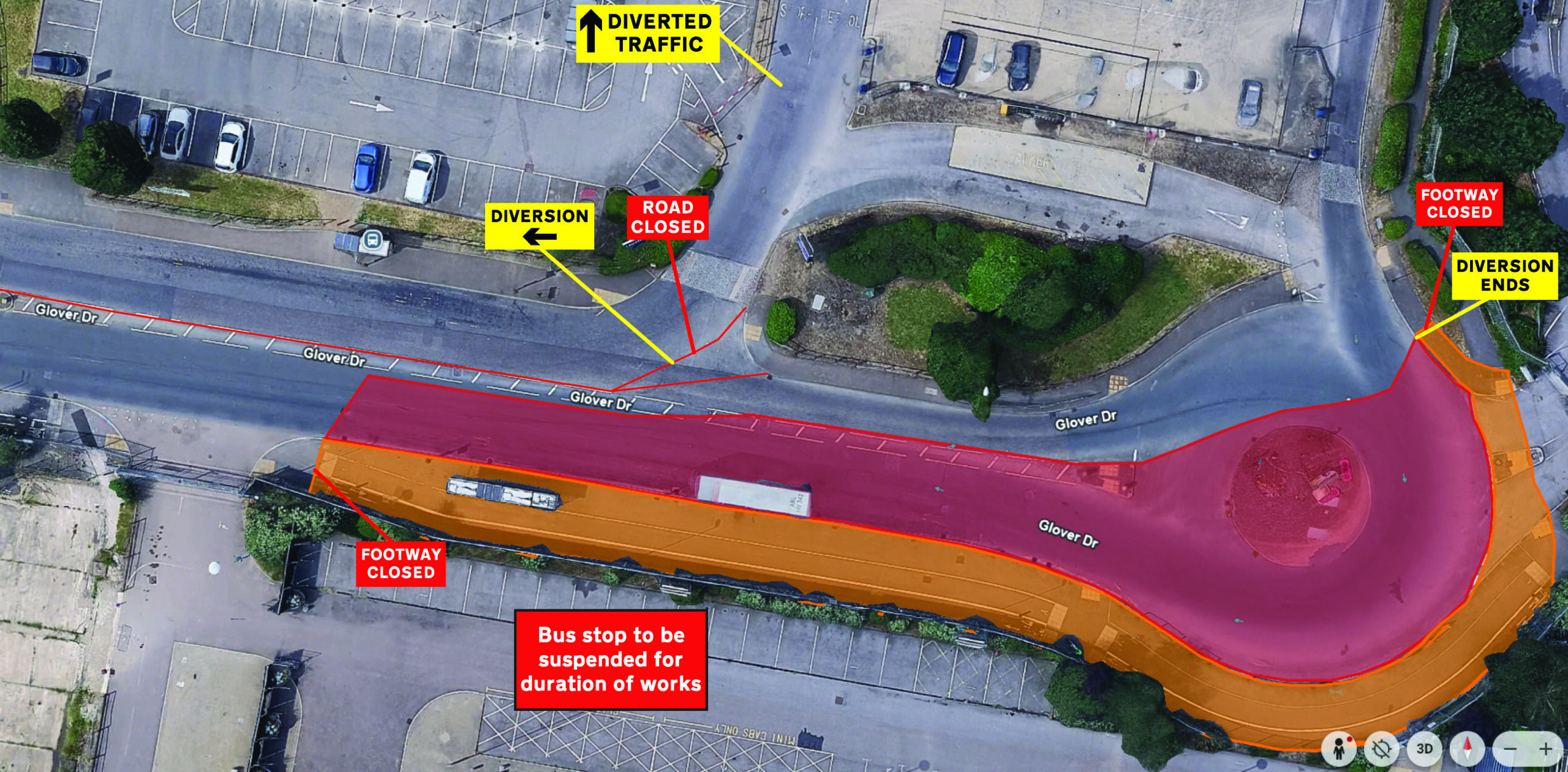 The following section of works will take place from 27/11/2025 to 29/11/2025. During this phase Glover Drive will be close as well as the footway for pedestrians. A route diversion will be in place and can be seen below.