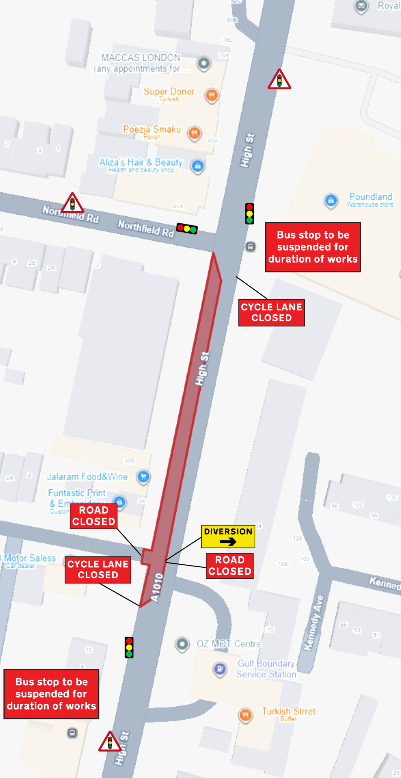 Works on High Street EN3 will take place from 13/10/2025 to 08/11/2025 4-weeks duration. During this phase, a set of two-way traffic lights on High St EN3 will be installed to facilitate the installation of the District Heating pipes. However, the right and left turn into and out of Southfield Rd EN3 will be prohibited. Please see copies of the traffic management plan and Diversion route below.